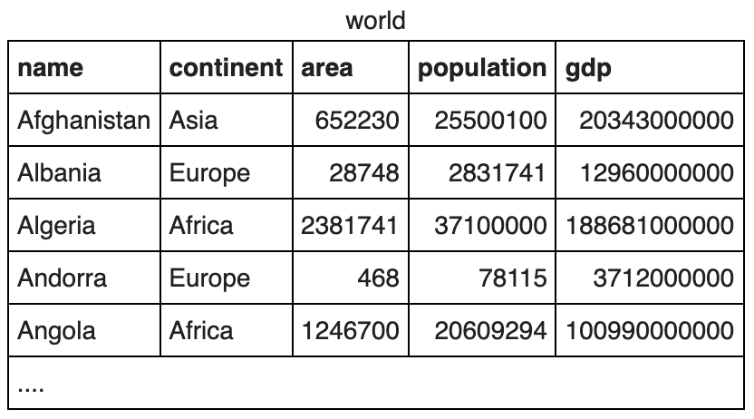 1. The example uses a WHERE clause to show the population of 'France'. Note that strings (pieces of text that are data) should be in 'single quotes';